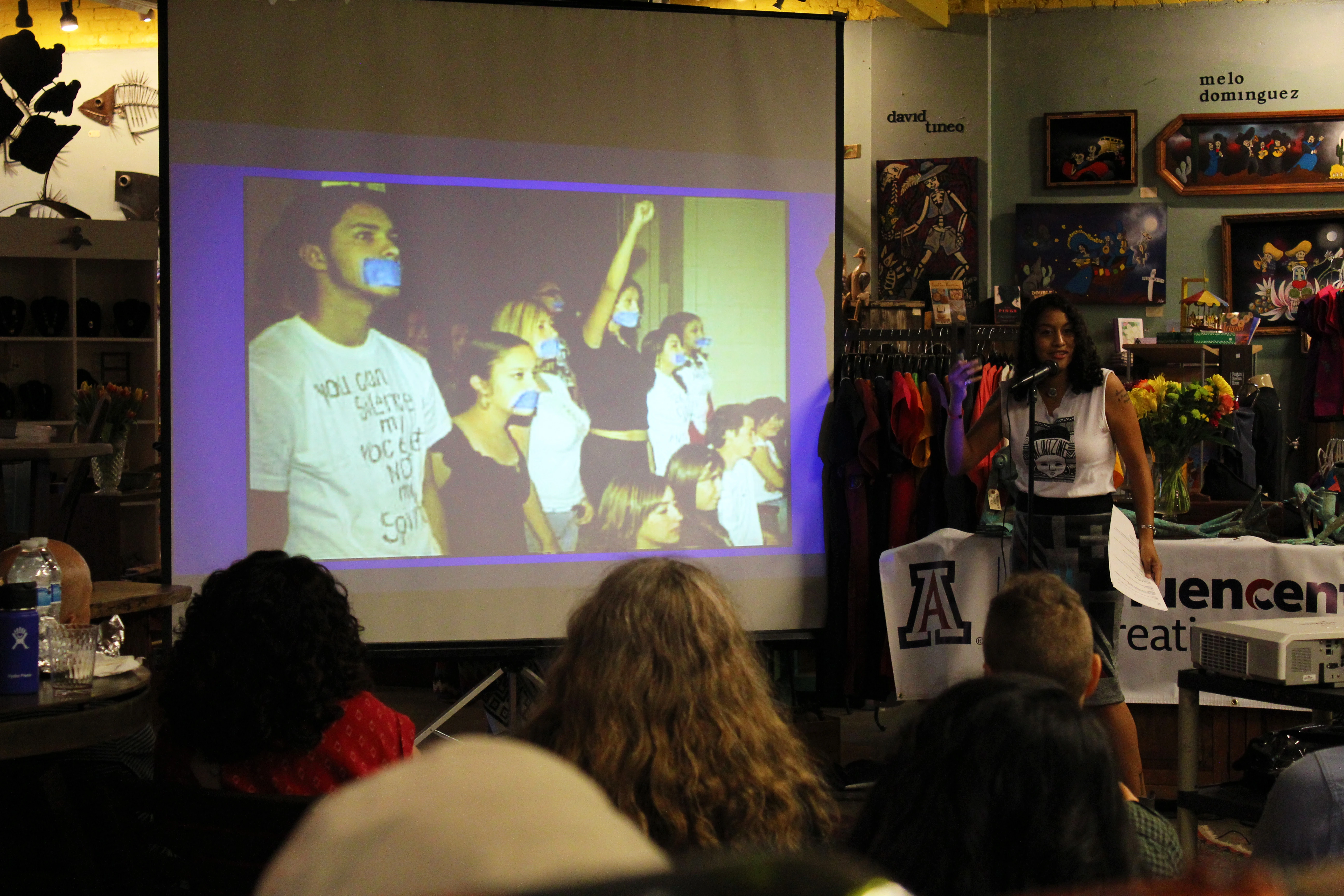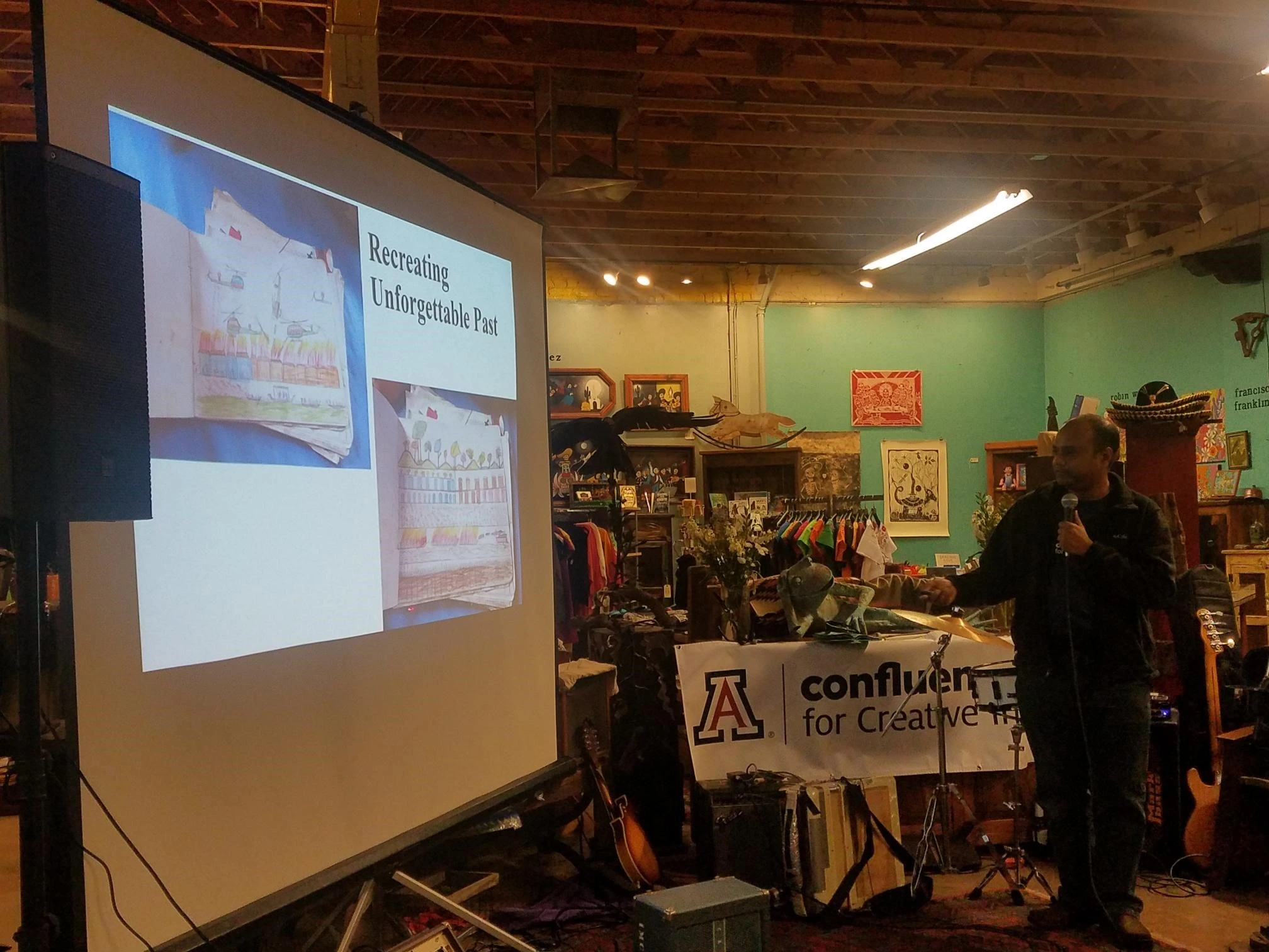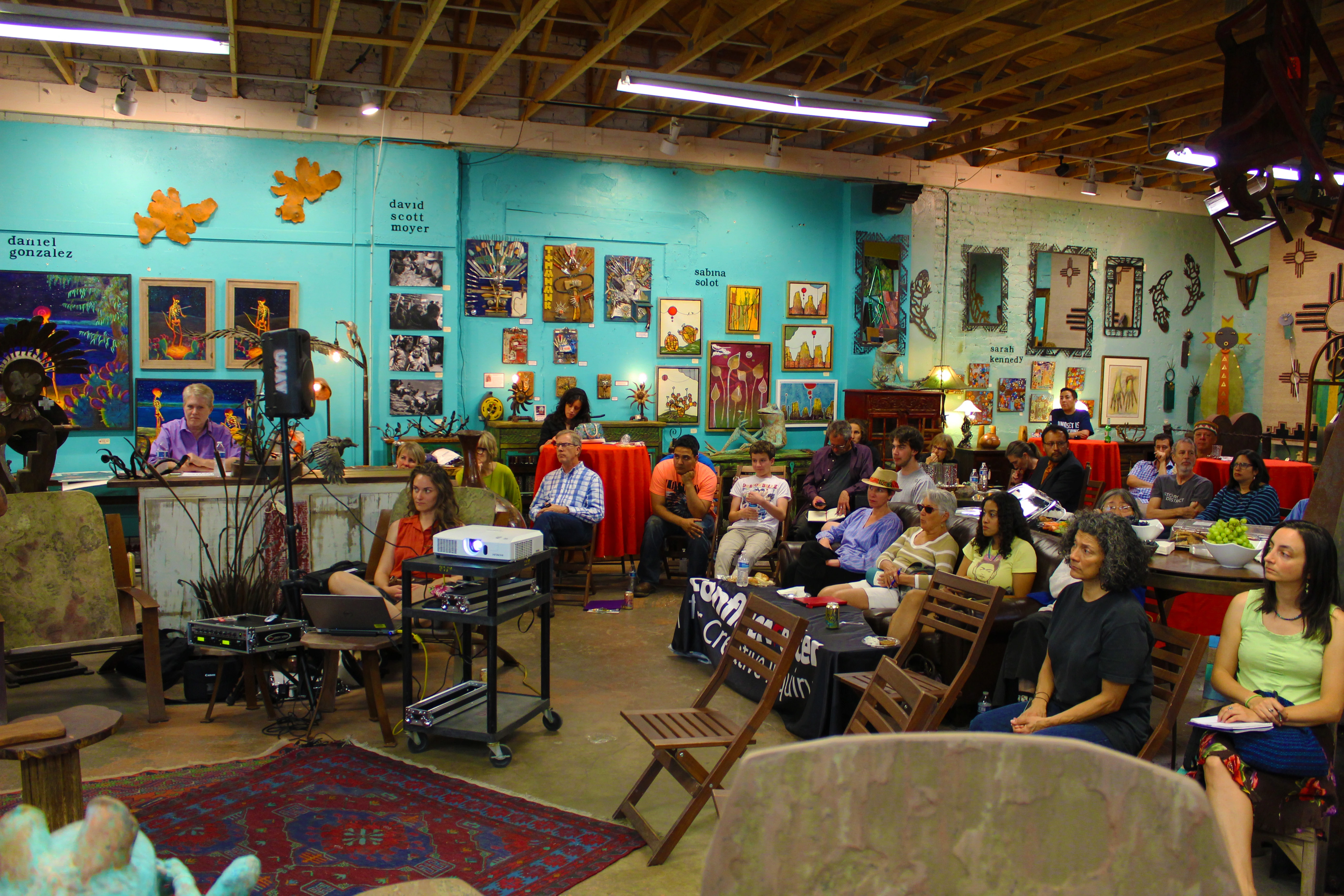 People gathering in a shared space waiting for a discussion to start with a focus on an older man in a jean jacket and red hat. There is also a women in a blue coat with a purple lapel.