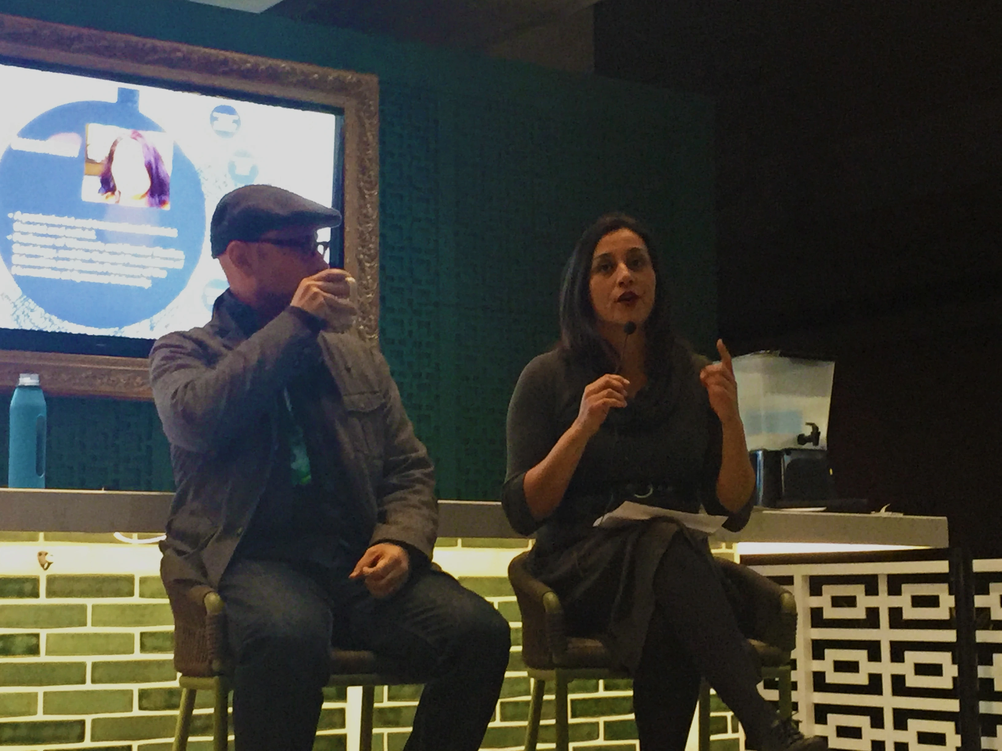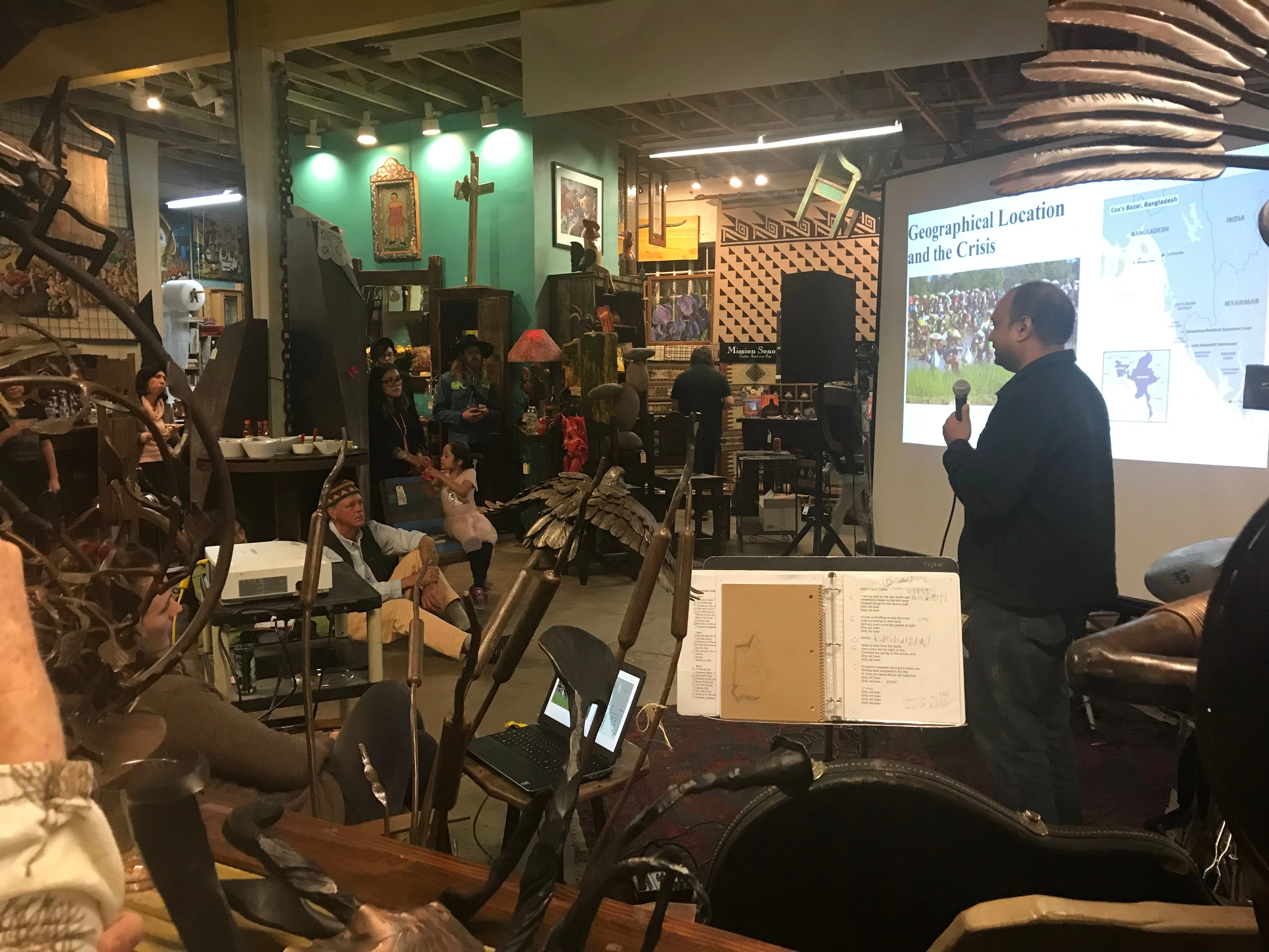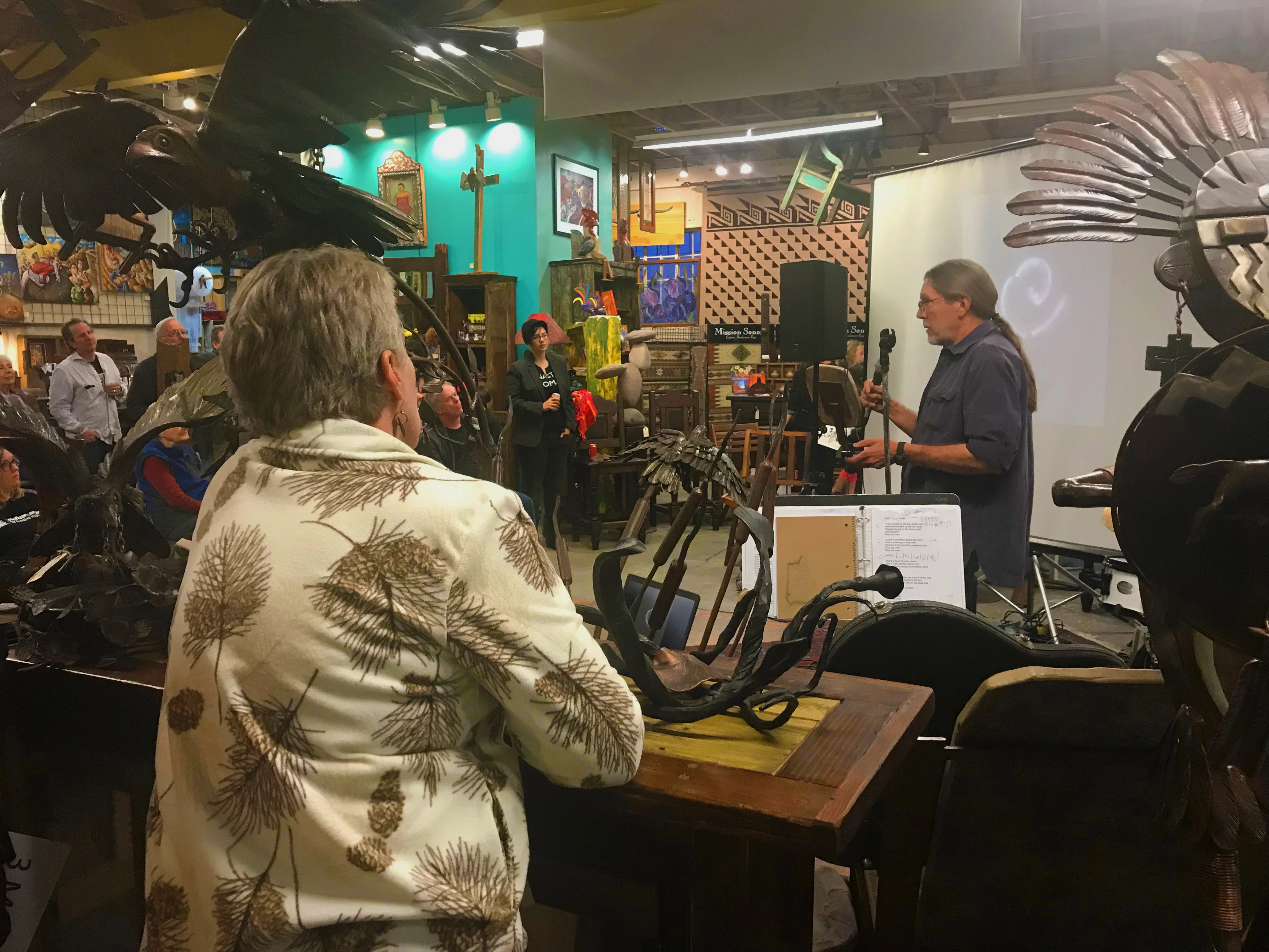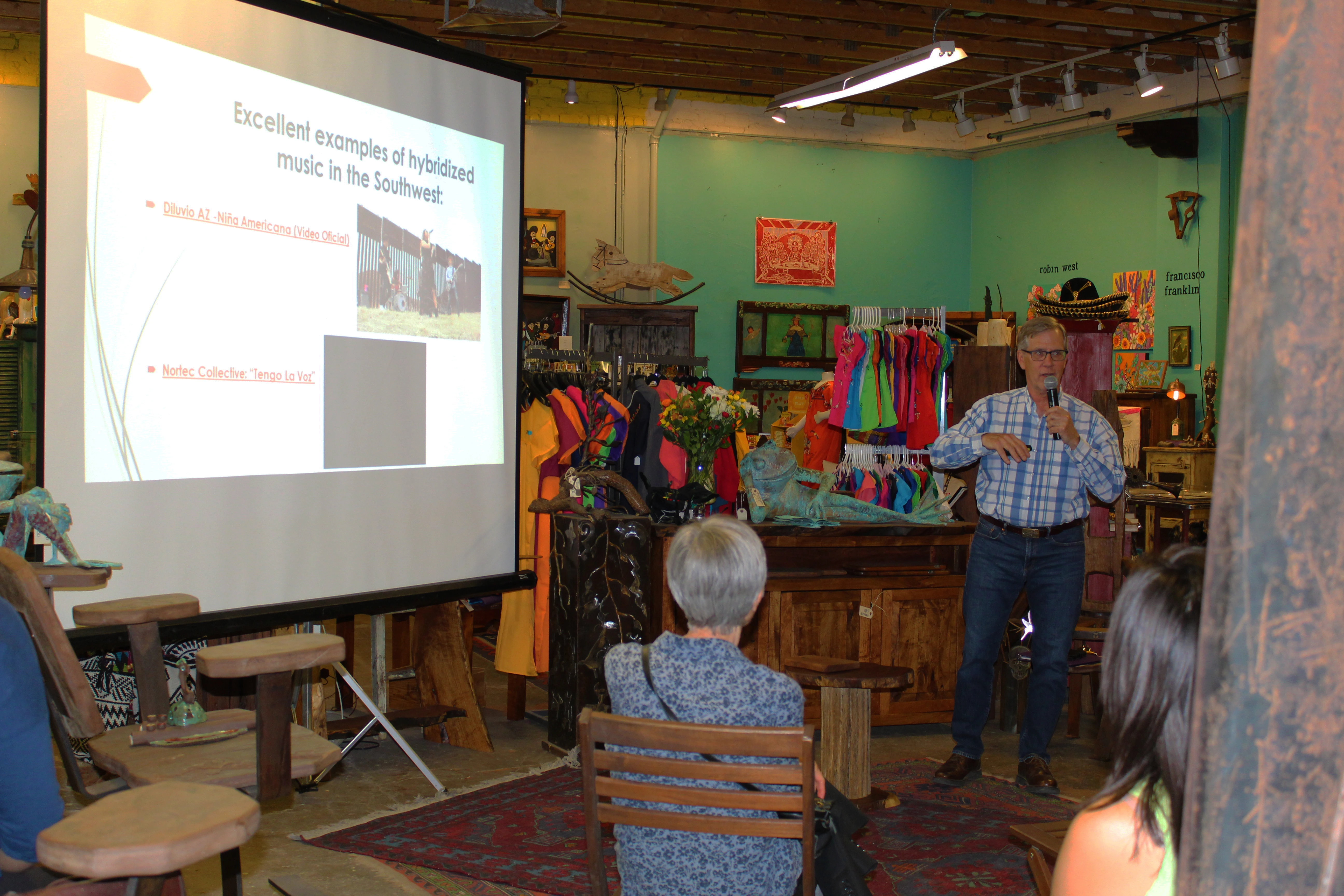 Show and Tell presentation in a room with teal walls and exposed wood beam ceiling. Dr. Javier Duran speaks at a microphone on the right while another man reaches for a guitar in the center. A woman with blonde pigtails and a purple rose lapel pin sits in the foreground. A large projector displays the presentation.