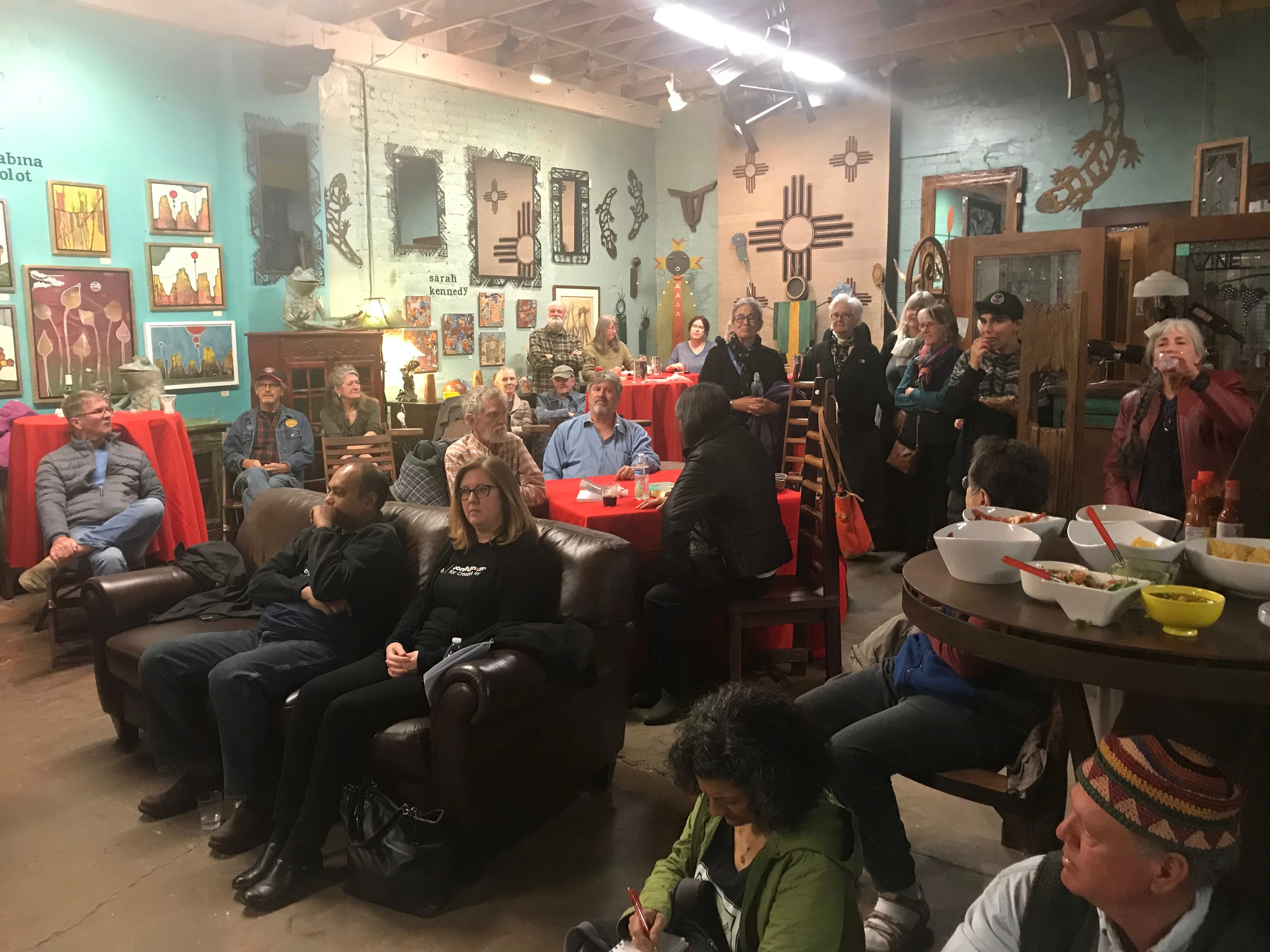 People gathering in a shared space waiting for a discussion to start with a focus on an older man in a jean jacket and red hat. There is also a women in a blue coat with a purple lapel.