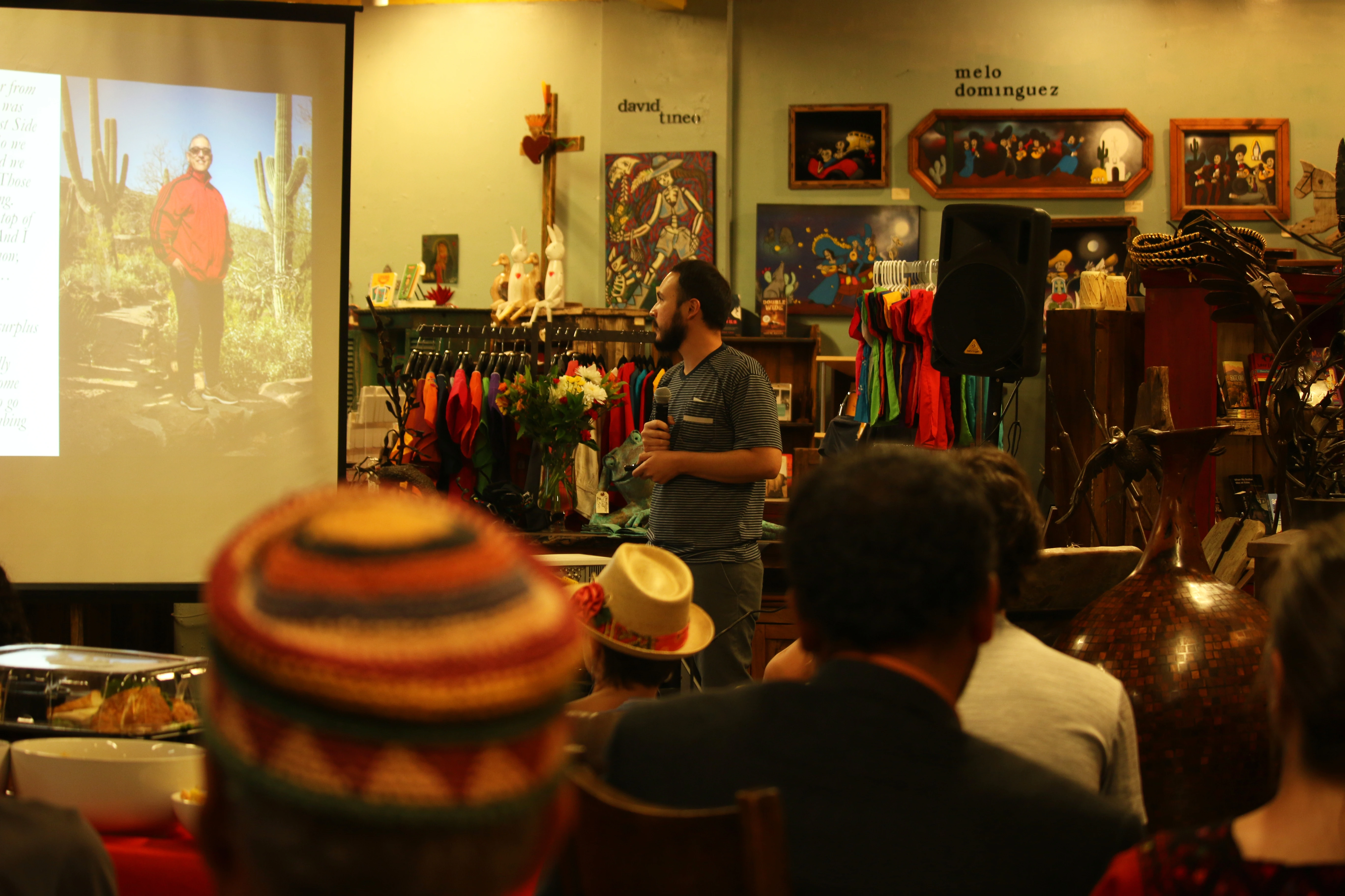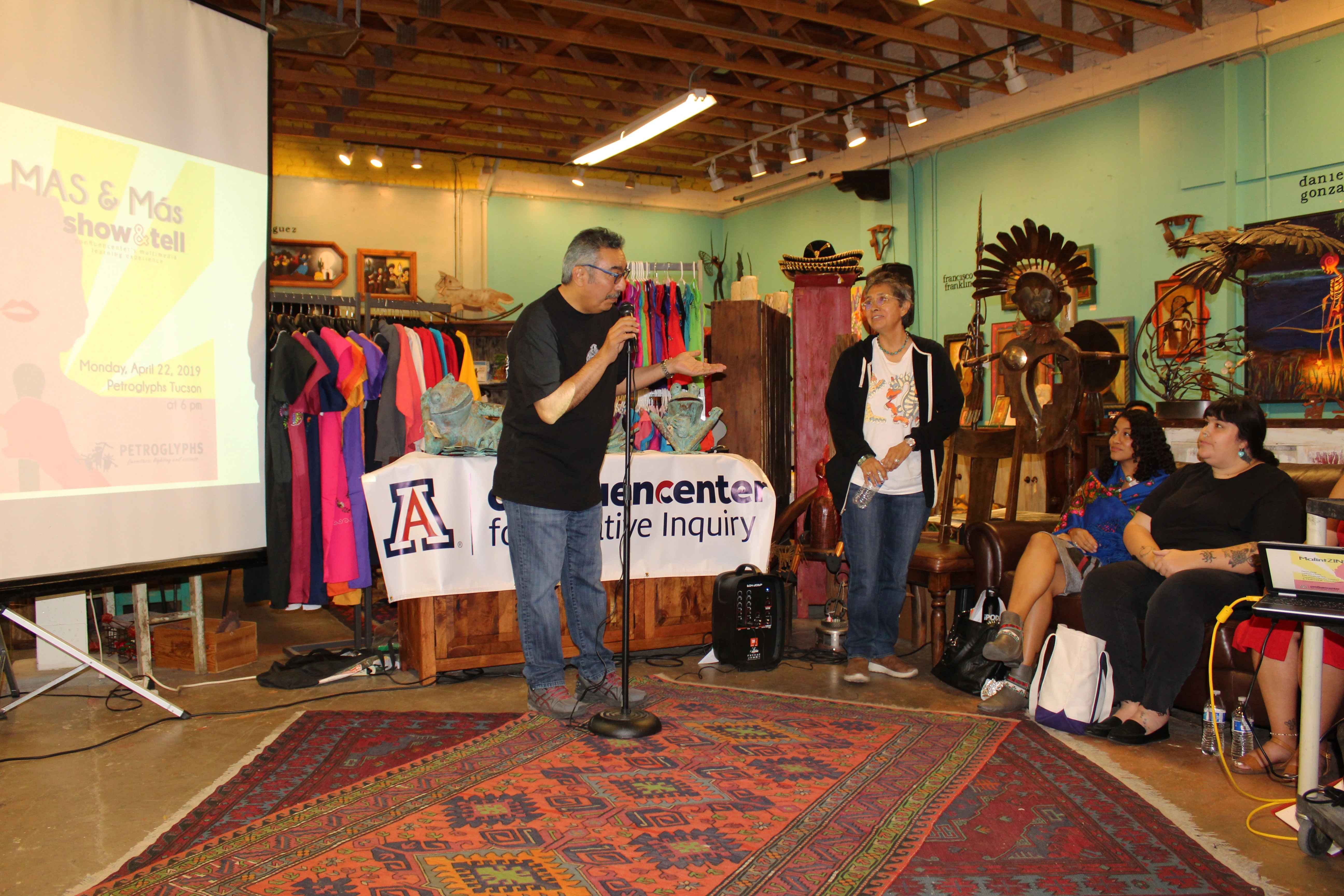 Show and Tell presentation in a room with teal walls and exposed wood beam ceiling. Dr. Javier Duran speaks at a microphone. A large projector displays the presentation.