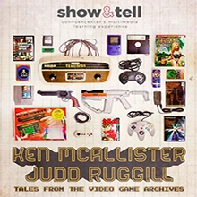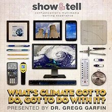 Show and Tell presentation in a room with teal walls and exposed wood beam ceiling. A presenter speaks at a microphone. A large projector displays the presentation.