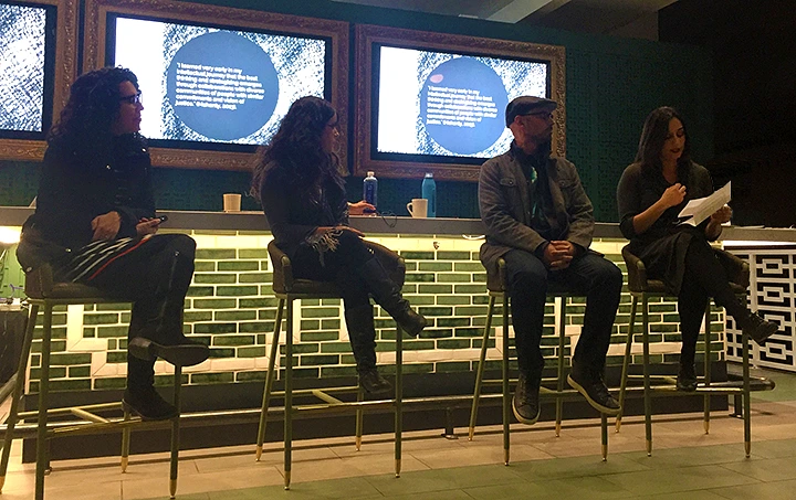 Hotel Congress neon sign above and behind a projection screen with a message about borders